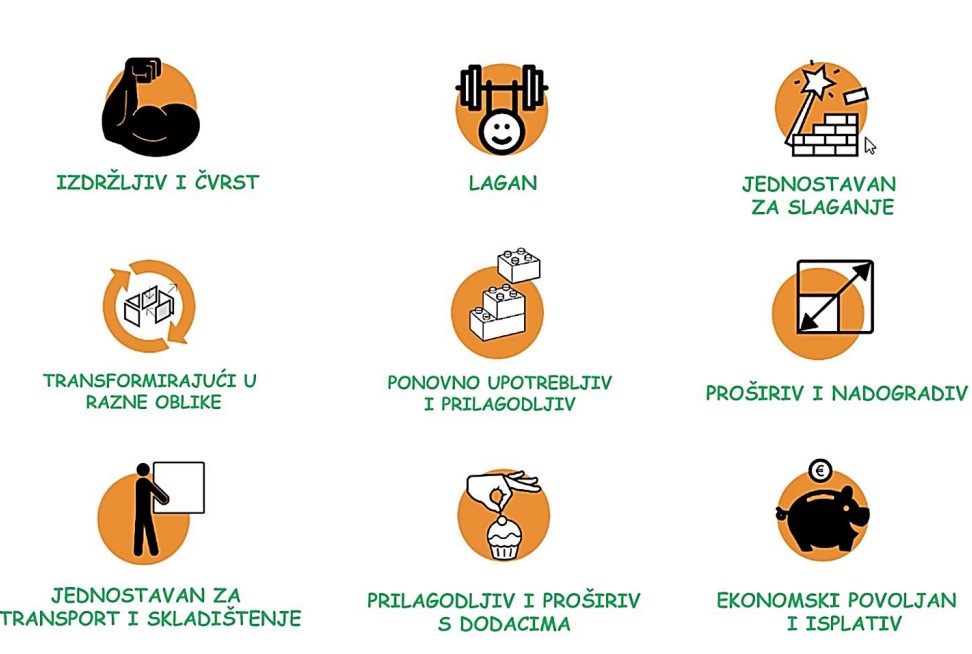 Modularni elementi – mogućnost korištenja istih elemenata za više izvedbi (štandovi, promo pultovi, scenografije, police za trgovine itd.)