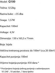 Q100 je najmanji uređaj za raspršivanje mirisa iz serije Q. Pruža savršenu ravnotežu između udobnosti i stila. Za rad uređaja možete izabrati između rada na 220V (električna mreža), spajanjem na računalo (usb) ili rad pomoću 1,5V baterija.