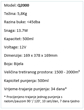 Q2000 je snažan, dobro dizajniran i sofisticiran uređaj. Programiranje uređaja i kontrola rada preko ugrađenog displaya je vrlo jednostavno i brzo. Korisnik može birati između 9 različith modova rada uređaja (rad/pauza), te programirati do 3 različita moda rada 24 sata za svaki dan u tjednu. Otvaranjem zaključanih vrata možete jednostavno pristupiti unutar perfumera, u kojemu se nalazi sustav za raspršivanje mirisa i spremnik ‘Essence Fragrances’ ulja. Oznaka CE koju nosi jamac je kvalitete i usklađenosti sa europskim normama.