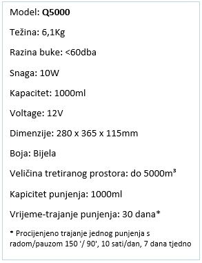 Q5000 je snažan, dobro dizajniran i sofisticiran uređaj. Programiranje uređaja i kontrola rada preko ugrađenog displaya je vrlo jednostavno i brzo. Korisnik može birati između 9 različith modova rada uređaja (rad/pauza), te programirati do 3 različita moda rada 24 sata za svaki dan u tjednu. Otvaranjem zaključanih vrata možete jednostavno pristupiti unutar perfumera, u kojemu se nalazi sustav za raspršivanje mirisa i spremnik ‘Essence Fragrances’ ulja. Oznaka CE koju nosi jamac je kvalitete i usklađenosti sa europskim normama.