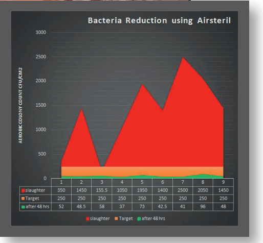Za posebno istraživanju učinkovitosti AIRSTERIL ULT uređaja uzorkovano je 18 trupla mesa govedine iz klaonice nakon klanja i nakon 48 sati hlađenja, te 9 jaradi u hladnjaku koji sadrži AIRSTERIL tehnologiju i 9 u kontroliranom hlađenju. Dobiveni rezultati pokazali su značajno smanjenje kontaminacije u prostorima tretiranim ULT uređajima i to u svim dijelovima postupka prerade i čuvanja mesa.