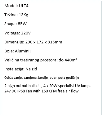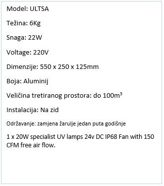 Profesionalni pročišćivač zraka za sanitarnu i konzerviranu hranu (industrija). Ubija klice i poboljšava higijenu vašeg radnog okruženja. Vrhunski proizvođač i dobavljač hrane mora održavati nisku razinu bakterija unutar radnog okruženja, na životinjskim truplima, voću i povrću te u cijelom okolišu. Tradicionalno čišćenje i dezinfekcija ne mogu dohvatiti i uništiti sve bakterije, područja kao što su stanice i vozila predstavljaju veći rizik od širenja patogena koji potiču raspadanje hrane i mogu širiti bolesti. Izrađeno posebno za prehrambenu industriju, ova robusna jedinica otporna na vodu ima varijabilnu snagu koja odgovara količini i upotrebi prostorije i kontrolira štetne bakterije i viruse u zraku i na svim izloženim površinama 24 sata dnevno, 365 dana u godini. Jedna Ultimate jedinica može pokriti površine do 440m3 (model ULT4). S VENTILATOROM ZA BOLJI PROTOK ZRAKA!