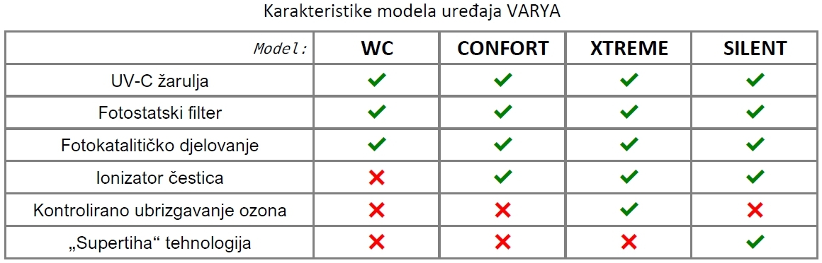 Pročišćivači zraka VARYA dizajnirani su za učinkovito djelovanje u sredinama do 125 kubnih metara (što odgovara površini od 45 četvornih metara). Za veće prostore moguće je instalirati više pravilno raspoređenih jedinica. Uređaji VARYA iz zraka uklanjaju preko 98% onečišćujućih tvari, bakterija, nanovirusa, alergena, hlapljivih organskih spojeva itd. Osim godišnje promijene UV-C žarulje ne zahtijevaju nikakvo održavanje i predviđeni su za neprestani rad 24 sata-365 dana u godini.