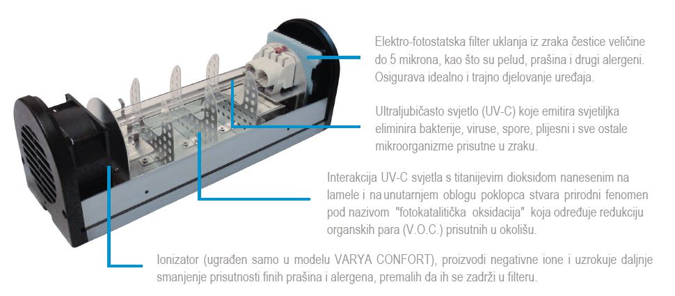 VARYA pročišćivači zraka sadrže inovativnu tehnologiju koja zrak tretira kroz nekoliko faza: